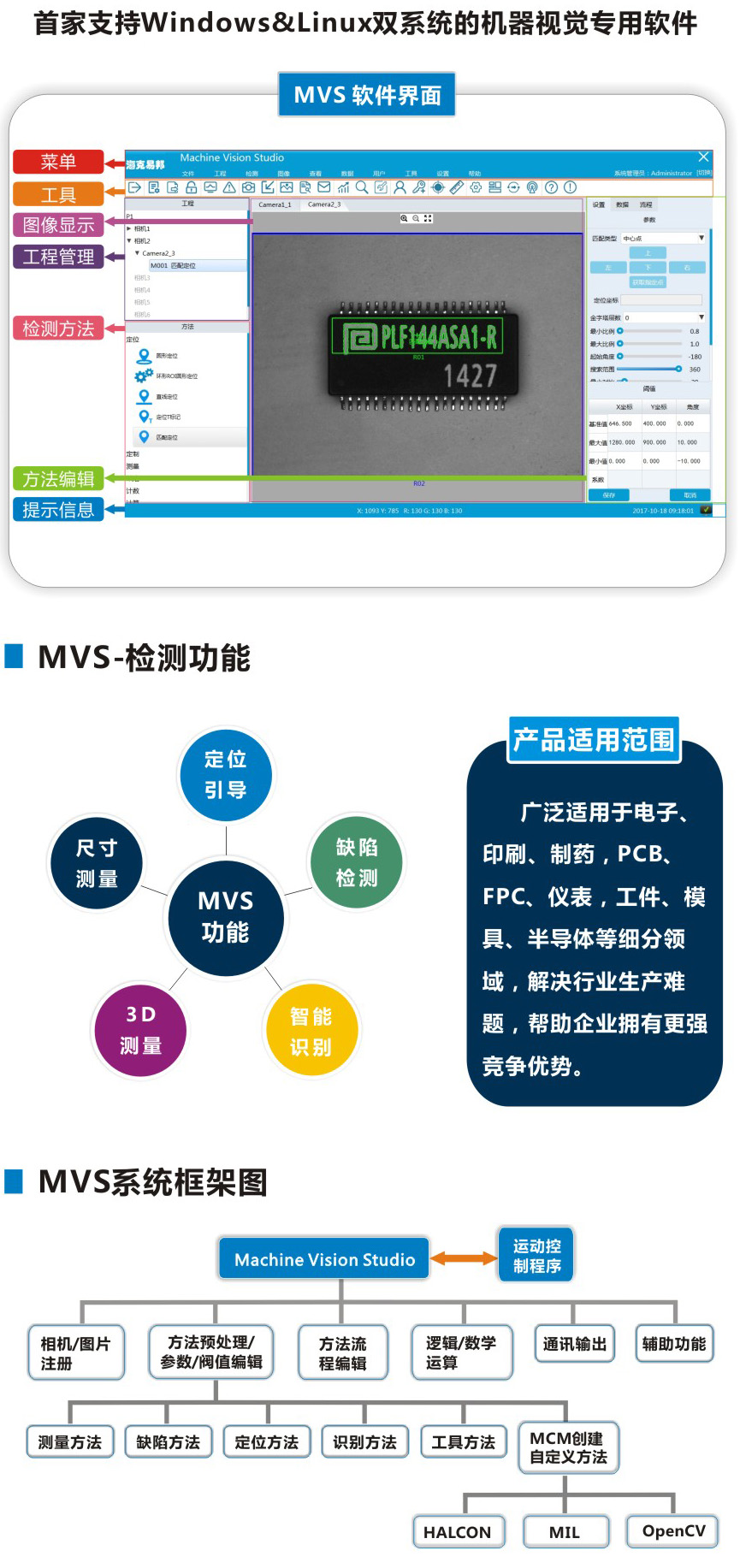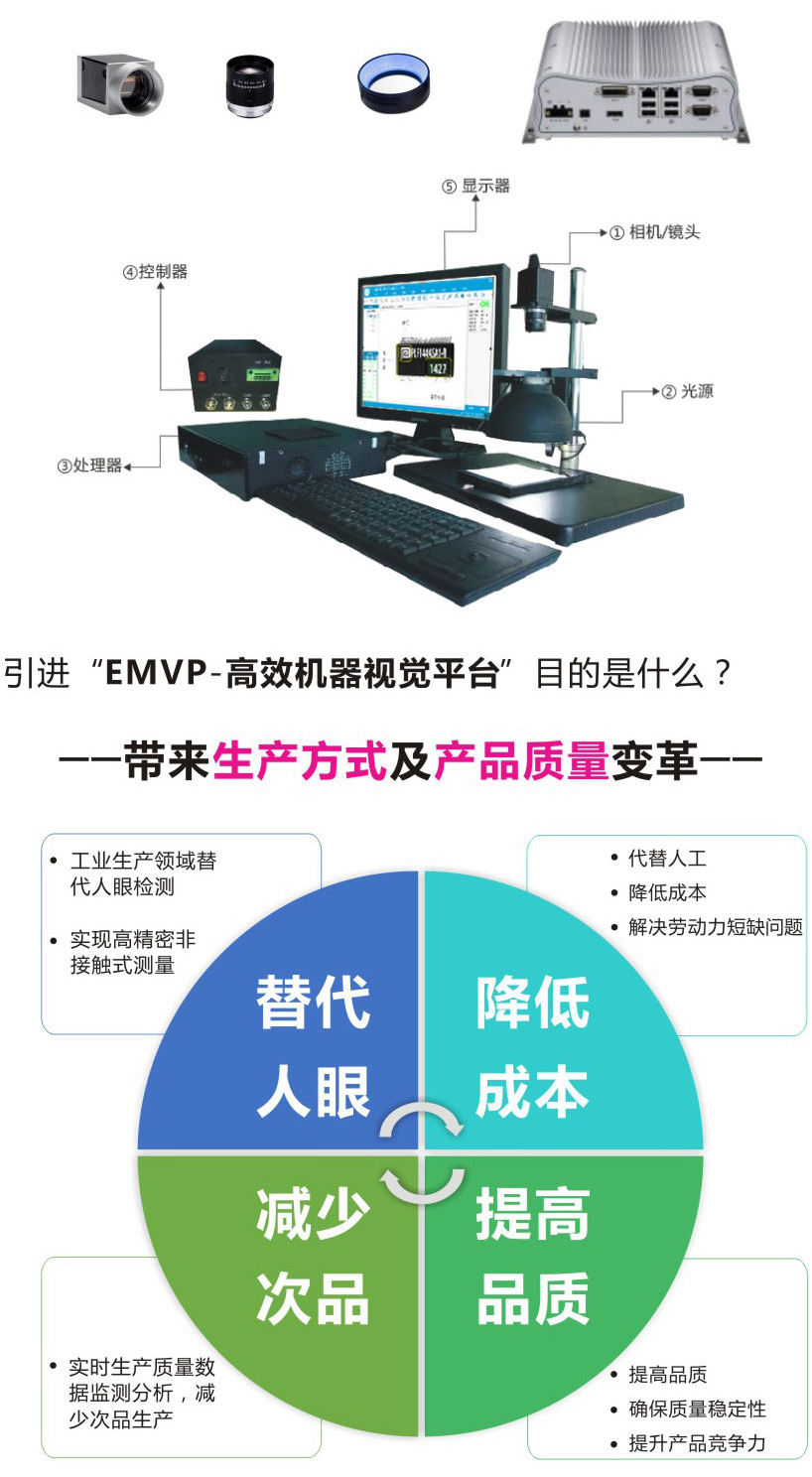 ▆ EMVP介紹 EMVP開(kāi)放式機(jī)器視覺(jué)平臺(tái)是海克易邦獨(dú)立自主開(kāi)發(fā)的機(jī)器視覺(jué)產(chǎn)品。該產(chǎn)品集軟件和硬件于一體,整合本公司在機(jī)器視覺(jué)行業(yè)十年技術(shù)積累,同時(shí)結(jié)合各類(lèi)視覺(jué)檢測(cè)的實(shí)際需求而推出,為客戶提供最優(yōu)的機(jī)器視覺(jué)解決方案。產(chǎn)品軟件最新推出MVS版本,操作更加簡(jiǎn)單,設(shè)置更加靈活,同時(shí)支持高級(jí)用戶二次開(kāi)發(fā)。EMVP機(jī)器視覺(jué)平臺(tái)具有集成度高、功能豐富、穩(wěn)定可靠等特點(diǎn),適用于缺陷檢測(cè)、尺寸測(cè)量、定位引導(dǎo)、字符識(shí)別、平整度檢測(cè)等機(jī)器視覺(jué)應(yīng)用領(lǐng)域。